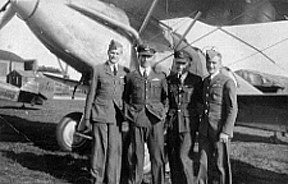 Bob Bungey, myself & two Australians...(Farrington collection) Caption: ALF. Bungey, centre left, Farrington centre right. With wings. Farrington remarked that the other two, Anderson (left) and Moreland (right), had joined the RAF directly (as their lighter RAF blues confirm). From the late 1930s on into 1940, men from around the Commonwealth took a punt and travelled to Britain in hope of gaining an RAF commission. Many succeeded. The aircraft is a Hart Trainer (long exhaust, tandem cockpits) which may place this shot to Montrose, Autumn or Winter 1937.