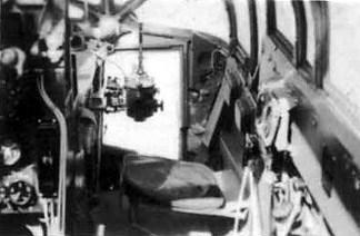 The WOp/AGs “office” in a VGO-equipped Blenheim I, looking aft. The gunner’s backless saddle-shaped seat is in the centre foreground, lit by the light streaming in through the turret glazing above. The seat was an integral part of the Bristol B1 turret/gun mount, with it's central column and cupola, all raised, lowered and rotated together by hydraulic power. Thus the seat revolved with the turret and gun. The spade grips of the turret gun controls are clearly seen, mounted on the central column.