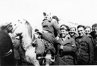 To the front, Greece 1941 (C Hansford) A mixed bag of Greeks and RAF servicemen, apparently. Cecil subsequently identified this shot as at Agrinion in 1941, with McBride mounted on the donkey, then (left to right) Cpl J Townsend, WA Lee (possibly Fitter IIA 622386 AC1 Lee W later of 72 OTU), J Owens (possibly Fitter IIE 572463 LAC Owens JL later of 72 OTU), Robson and B Crutchley (possibly Fitter IIA 572767 LAC Crutchley BR later of 72 OTU), all of whom signed the shot along with LAC Dave Ray—who is obscured behind the villager, left.