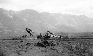 The aftermath of another raid at Paramythia, March 1941 (C Hansford) Cecil was with ‘C’ Flight, down by the river, to the right of these images. To the left of the smoking wreckage, Paramythia lies on the lower slopes of Mount Koryllas. See also CFR Clark, RJ Dudman and HF Squire.