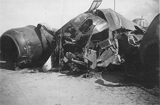 211 Sqd El Dhaba. Night Landing. A/c flew under telegraph wire, hit pile of railway sleepers. Pilot & nav badly hurt. Blenheim I 1940. F/O Peter Collier WOp/AG Thomas. (EL Cooper) This and other photographs of the accident to L1486 was also held by other Squadroon members: Grierson, Hoyes, Sainsbury, Sharratt and Wingrove.