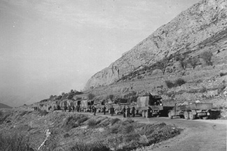 211’s convoy passes a column of advancing Greek troops with some what more economical transport (EL Cooper)