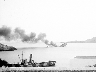 Our rescue boat gone Kithera Tuesday 29 April 1941 It was the next morning before she sank. The Greek Navy tug (foreground) ran ashore, almost undamaged. In the end it was the Royal Navy to the rescue: they were picked up by HMS Auckland that night. Arriving in Crete, they transhipped to a transport for the final leg to Alexandria.
