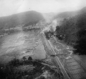 Chiengrai-Lampang road patrol 10 November 1944 (RAF official via Peter Spooner) [Four 211 Squadron Beaufighters patrolled the road, attacking motor transport, steam rollers and other road traffic. All returned safely to Chiringa. Closer examination shows that the bridge in left middle ground has already been destroyed and the small hut on the edge of the river vegetation just this side of the bridge is damaged. A solitary figure stands below the road embankment near a drain.]