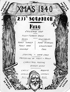 211 Squadron Christmas Menu 1940 (Fryatt family collection) Run off in numbers by the Photo Section bods, the menu was typical of those Service days, decorated with an elaborate seasonally apt border by one of the resident Squadron artists. He may have been an old hand—the corners were arranged to carry a list of all the Squadron’s stations: Mildenhall, Grantham, Helwan, Ramleh, Ismailia, El Daba, Quotafiya and Menidi.