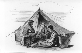 Off duty, Paramythia 1941 (Gordon-Finlayson collection)In JG Sharratt’s original photograph, the three are identified as Peter Dennis (left) and Paddy Kavanagh (centre) playing chess, while Doug Davis (right) looks on.