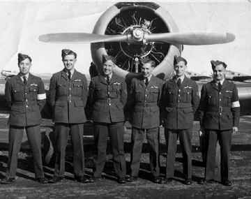 JS Mitchell (far right) and fellow pilots “somewhere in Canada” 1943 (Mitchell) Photographed at an RCAF Service Flying Training School in Alberta, Canada, part of the war-time EATS/BCATP aircrew training scheme. In the right background are two Avro Ansons in Canadian markings (the very large serial nos) and of Canadian build (the long-chord cowling and reduced glazing suggests the Mark II). Ansons were built in quantity for the RCAF. The aircraft behind the boys and in the left background appear to be Canadian examples of the North American Harvard much used in the training role in Canada and in the RAF.
