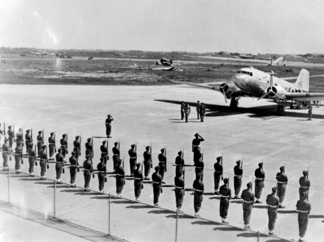 Supreme Commander SEAC Lord Mountbatten arrives, Don Muang, January 1946 (Ramsay family collection) Monty Walters shot of this occasion is from alongside the aircraft.