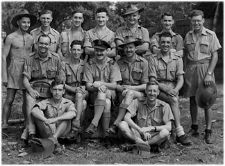 Signals Section 211 Squadron c1945 (Ramsay family collection) A fabulous shot of a cheerful group in various states of “undress”, surrounding their Flight Lieutenant. Les Ramsay is 2nd from the left, hatless, in the back row. Possibly taken at Chiringa (see for example the Burma Quartet group MT Section Chiringa). It certainly has the same sort of happy atmosphere.