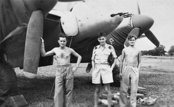F/Lt AH “Jock” Russell, pilot (left), S/Ldr Frank Morton Bruckshaw, F/Lt Peter Spooner (navigator/wireless operator), right (P Spooner) The Mosquito is R-Roger (RF756), photographed at St Thomas Mount. The engine cover is marked P (port engine).