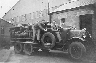 Where’s the fire? Aldergrove, January 1938 (Aistrope family collection) A bit of off-duty horseplay on a dull chill day. Don Boehm rings the fire-bell madly as the “driver” looks on. The fire-truck is serious kit on an RAF station, of course. In the early 1930s the service was equipped with several types of fire tender, including Crossley, Ford and Morris Commercial designs all with the 6 x 4 wheel arrangement. This Morris Commercial example wears dismountable half-tracks on the rear driving wheels while the bonnet is covered against the cold. The state of the airfield at Aldergrove that Winter left them dealing with the minor drama of nose-overs but no fire, fortunately.
